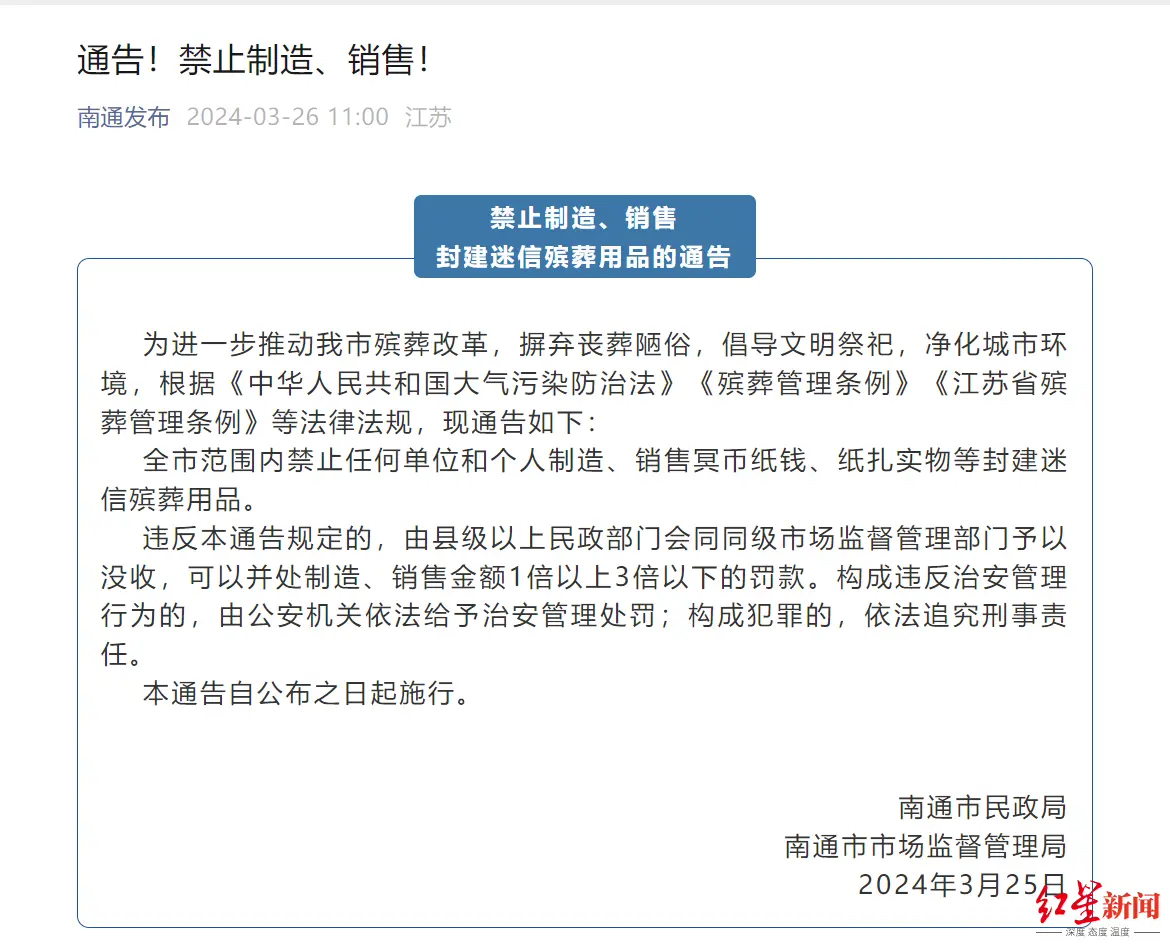 南通禁止制造销售冥币纸钱纸扎,当地12345:接到大量市民电话,政策暂未调整 3月26日,江苏南通市民政局和南通市市场监督管理局通过“南通发布”发布了一条“禁止制造、销售封建迷信殡葬用品的通告”,其中规定全市范围内禁止任何单位和个人制造、销售冥币纸钱、纸扎实物等封建迷信殡葬用品,随后引发关注。 3月27日,红星新闻记者从南通市12345工作人员处了解到,该消息发布后,他们接到大量市民电话,部分市民认为该政策“一刀切”并不合理,目前已经将市民意见反馈给相关部门,但是暂未收到政策调整的消息。 红星新闻记者梳理后发现,清明节前夕,全国多地发布了关于禁止制造、销售封建迷信殡葬用品的通知,有地方还对封建迷信殡葬用品做了“交通工具”、“生活用品”等分类。河南泽槿律师事务所主任付建表示,多地禁止生产、销售封建迷信殡葬用品是符合相关法律法规的,但在发布时建议做好前期宣传工作,让居民更易接受。 图为南通市发布的禁止制造、销售封建迷信殡葬用品的通告 南通发布最新通知:制造销售纸钱纸扎,要遭罚款甚至追刑责 据南通市民政局和南通市市场监管局3月26日发布在“南通发布”上的通告称,为进一步推动南通殡葬改革,摒弃丧葬陋俗,倡导文明祭祀,净化城市环境,根据《中华人民共和国大气污染防治法》《殡葬管理条例》《江苏省殡葬管理条例》等法律法规,全市范围内禁止任何单位和个人制造、销售冥币纸钱、纸扎实物等封建迷信殡葬用品。 该通告称,违反通告规定的,由县级以上民政部门会同同级市场监督管理部门予以没收,可以并处制造、销售金额1倍以上3倍以下的罚款。构成违反治安管理行为的,由公安机关依法给予治安管理处罚;构成犯罪的,依法追究刑事责任。该消息发布后,引发很多网友关注。有人表示此类政策是为了减少环境污染,为了摒弃封建迷信、保护环境无可厚非,而且缅怀逝者的方式有很多,不一定非要使用焚烧纸钱纸扎的方式。 有网友指出纸钱纸扎属于传统,不应该一刀切,图为焚烧纸钱纸扎(资料图) 不过也有人认为纸钱纸扎属于传统。“去年我们一家人在给去世的奶奶折纸钱,坐在一起的时候说起很多奶奶在世时候的事情,感觉并不是封建,而是寄托了一种思念。”有网友这样说。 当地12345:接到大量市民电话,政策暂未调整 3月27日,红星新闻记者多次拨打发布该通告的南通市民政局及南通市市场监管局电话,但其公布在网上的值班电话无人接听。南通市民政局下属的海安市民政局一名工作人员对红星新闻记者表示,他们目前还没有接到上级单位的正式文件,他们也是从网上看到了相关的消息,如果有上级单位通知,他们也会按照要求执行。 南通市12345工作人员表示,该通告发布后,他们便接到了大量的市民咨询电话,其中部分市民对此政策表示了不认同,并表示有“一刀切”嫌疑。 南通市12345工作人员表示,目前该政策还没有调整,一切以已经公布的内容为准,但他们已经将市民反映的问题上报给了相关单位,“我们也在等后续的消息,市民可以关注后续的发布”。 红星新闻记者注意到,就在“南通发布”发布此通告后不久,又发布了一篇清明节文明祭祀倡议书,其中提到“清明祭扫,重在心意,贵在真诚,让我们采用鲜花祭扫、植树缅怀、书写寄语、网络追忆等绿色环保方式祭奠先人、感念先辈。严格遵守城市管理有关规定,将慎终追远的情感融入现代文明表达方式。” 2024年3月16日,江苏南京,清明节将至,墓园内鲜花祭扫的场景随处可见 清明节前多地出台规定 禁止生产销售封建迷信殡葬用品 红星新闻记者梳理后发现,今年清明节前,国内有多地也出台了禁止生产销售封建迷信殡葬用品的相关规定。 辽宁省凌源市3月11日发布《关于禁止制造、销售、焚烧迷信祭祀殡葬用品的通告》,规定禁止在公共区域焚烧封建迷信殡葬祭祀用品。对于制造、销售封建迷信殡葬用品的,由民政部门会同市场监督管理部门进行依法查处。露天焚烧和占道销售封建迷信殡葬用品的,由城市综合执法部门进行查处。对于阻碍执法人员执行公务的,由公安机关依法予以治安管理处罚。造成严重后果,构成犯罪的,依法追究刑事责任。 黑龙江省嫩江市在3月26日发布《关于进一步治理城区室外销售和焚烧祭祀用品的通告》,严禁任何单位和个人在室外销售各种冥纸冥币等祭祀用品。禁止在城区道路两侧、广场、公园、草坪绿化带等公共场所和区域焚烧祭祀用品。市民政局对殡葬服务机构及公墓焚烧祭祀用品进行规范管控;市市监局对店内经营封建迷信殡葬用品行为进行查处;市城管执法局对店外摆放、占道经营殡葬用品及在禁烧区域内焚烧祭祀用品行为进行查处。对阻挠执法的,由公安部门依法严厉打击。 天津市和平区民政局本月发布《严禁生产、销售封建迷信殡葬服务用品的通知》,对严禁生产、销售的封建迷信殡葬用品进一步明确,包括冥币、纸钱等“金钱”类,纸牛、纸马、纸轿车等“交通工具”类,纸人、纸彩电、纸箱子等“生活用品”类,以及与其他带有明显封建迷信性质的用于丧葬活动的物品,不同材质但与以上几类用途相同的物品均视为严禁生产、销售的封建迷信殡葬用品。 律师说法:提前做好宣传教育,更易让老百姓接受 根据南通市发布的消息,规定禁止生产、销售冥币纸钱、纸扎,是根据《