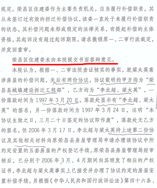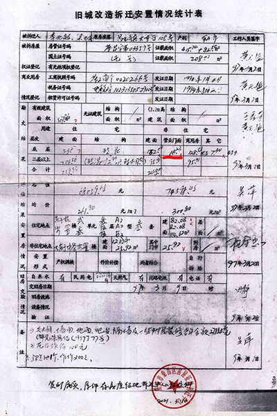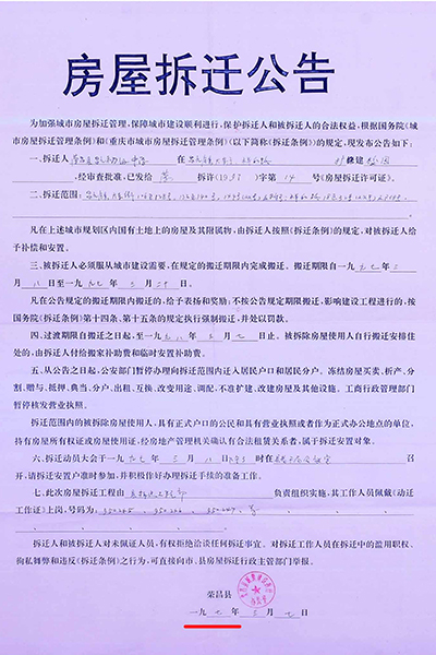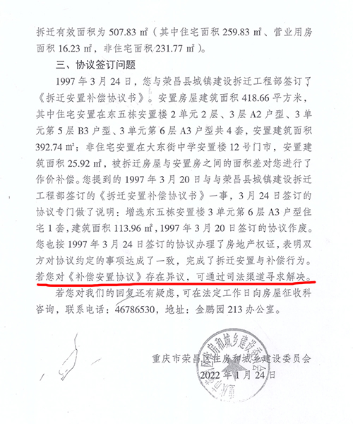 | 重庆荣昌区原房管局:06年多收被安置户房款7.8万牵出“案中案” 独立撰稿人/邓爱华 1997年旧城改造,房管局长隐瞒政策,安置面积缩水,门面充住房安置,领款凭证变成交款收据,2006年多收被安置户房款7.8万元。 被安置户通过信息公开,及在房管局内部人员帮助下,调取到当年拆迁安置补偿情况和政策文件。住建委要求被拆迁户走司法途径,一审二审再审建委却以“超过起诉期限、补偿安置方案已履行”为由不到庭,法院不开庭,以书面形式审理后驳回诉求,检察院也不支持监督申请。拆迁科长一句话,去中天公司查领款凭证,却牵出另一个案子。拆迁工程部变成中天公司,由房管局办公室主任1999年注册,正副局长、会计(职工家属)参与,40个股东(5人每人出资2.2万元,35人每人出资2万元),负责代办房屋拆迁、安置,房地产信息咨询、交易代理,丈量面积,代办房地产报批,房屋招租。 40个股东拥有50个门面,坐分租金,后因政策变动对门面进行分批处置。 2021年2月份卖了6个。3月份公开竞卖21个,底价高达2159万元,其818.59㎡面积哪来的?目前,50个门面全部卖完。 01 房管局副局长说,今年的拆迁政策是,各了各的算,口头传达的,没有拆迁文件? 1997年,荣昌县昌元初级中学扩建校园,需拆迁昌元镇大东街106-128号、132号-140号、144号(双号)及附号、祥和路18至32号(双号)及附号等约六千平方米建(构)筑物。 3月8日,在县老干局会议室召开拆迁安置动员大会,房管局副局长张远淑(下称张局长)主持会议,说今年的拆迁政策是,各了个各的算。房管局按评估价把你的房子买过来,修好后你又按评估价买回去。 梁太英说:“我和我老公多次要求看拆迁文件,张局长说是口头传达的,没有拆迁文件。” “我是在2020年5月12日通过政府信息公开方式,才获取由重庆市住房和城乡建设委员会提供的1997年重庆市城市房屋拆迁适用的是《重庆市城市房屋拆迁管理条例》(重人发〔1992〕19号),又在2022年1月5日获取由重庆市荣昌区房屋征地拆迁中心(下称征地拆迁中心)获取的《荣昌府发〔1995〕60号关于旧城改造中商业用房的认定及安置的通知》早在1995年3月24日出台。” ![]() (重人发〔1992〕19号)。梁太英 供图 ![]() 荣昌府发〔1995〕60号。梁太英 供图 “虽然在2022年调取的房屋拆迁公告显示有拆迁条例,其真实性存在问题。日期也是‘197年’3月7日,为三国时期。” ![]() 2022年调取的房屋拆迁公告。梁太英 供图 “在2007年调取的《拆迁安置补偿协议书》里,仍然没有公开当年拆迁安置补偿政策文件依据。” 02 住宅面积109.51㎡改为259.83㎡,非住宅由397.67㎡改为248㎡(商业用房223.52㎡、其它7.34㎡、营业用房只有16.23㎡) 房管局下属部门荣昌县城镇建设拆迁工程部(下称拆迁工程部)在拆迁动员大会之前的1996年4月18日已对昌元镇大东街108号李北超、梁太英私有财产进行了现场登记查勘(下称现场查勘表)。 ![]() 现场登记查勘表。梁太英 供图 梁太英说:“房屋一共三层,从2021年12月14日调取的《现场查勘表》数据计算,第一层201.685㎡,第二层195.85㎡,第三层109.51㎡,合计507.18㎡。查勘表注明,第一层、第二层为营业用房,共397.67㎡,第三层为住宅只有109.51㎡。” 查勘人黄天艳、王秀荣计算,三层合计才498.24㎡,比梁太英计算的507.18㎡少8.94㎡。最终认定有效面积为507.83㎡。 从2021年3月10日调取的1996年3月20日《旧城改造拆迁安置情况统计表》(下称拆迁安置统计表)来看,住宅面积由《现场查勘表》109.51㎡改为259.83㎡,非住宅面积由397.67㎡改为248㎡(商用房223.52㎡、其它7.34㎡、营业用房只有16.23㎡)。 ![]() 旧城改造拆迁安置情况统计表。梁太英 供图 梁太英说:“一楼进门门面是摄影器材→歌舞厅→包间→舞厅厨房,53.27㎡住宅面积从何而来?二楼前面是休息室→摄影场→餐厅→天井→餐厅备料间→餐厅厨房,哪来的259.83㎡住宅面积?三楼才是住宅,四个寝室,一共只有109.51㎡。” 03 第一份协议消失,第二份协议显示被安置户“签名”却申明作废,第三份协议有效又没有被安置户签名? 梁太英说,她家拆迁面积最多,安置面积最少,1997年拆迁,1998年搬进安置房后,因安置补偿不合理,一直没有去办理房屋产权证。是2006年3月房管局的人说,‘再不去交安置房款和办理房产证,就视为自愿放弃拆迁安置权利’。这一条款也写入了《拆迁安置补偿协议书》。 “3月14日,我才到房管局把《拆迁安置情况统计表》、《拆迁安置补偿协议书》(没有签名)拿回来,第二天才到大厅产权证登记窗口交钱,交钱后工作人员将统计表和协议收回,一个星期后,带上交款收据去领取产权证的。” 梁太英说:“交钱时那份协议,是第一份协议,下方注明有补门面款38000元、住房款50928.86元,这份协议之后消失了,只有一份收据,总金额为88928.86元,” ![]() 门面、住房交款收据。梁太英 供图 “那份协议,我也看见,补门面款38000块钱,住房补多少钱记不起了。”梁太英的女儿说。 “2007年,我到拆迁中心把《拆迁安置补偿协议书》调出来看,不是第一份办产权证那份协议,下面没有注明门面、住房补多少钱了,也没有显示我和我老公(已故)‘签名’。该协议为第二份,显示日期1997年3月24日。” ![]() 第二份协议,没有被安置户签字、盖印。梁太英 供图 之后,每次调出来的都是1997年3月24日那份协议。 梁太英说:“2021年3月10日,拆迁中心田静科长说找到我们当年签名的安置补偿协议了,