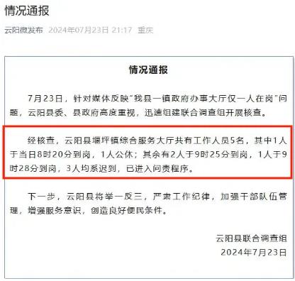 近日,重庆的刘先生发视频反映,镇政府办事大厅上午9点仅1人在岗。对此,重庆云阳县发布通报:经核查,云阳县堰坪镇综合服务大厅共有工作人员5名,其中1人于当天8点20分到岗,1人公休;其余有2人9点25分到岗,1人9点28分到岗,3人均系迟到,已进入问责程序。![]() 正观视评: 此前,该镇政府办公室工作人员告诉记者,事发当天,在刘先生去办理业务之前,工作人员已全部到岗,之后有些工作人员下村给脱贫户核算收入去了,有些到其他部室办公了。这个回应倒是没让人感到特别惊讶,甚至跟很多网友猜测的也相差不大,而云阳县的通报一出,无疑打脸了镇政府,同时也让网友们对此事开始“直视”。 刘先生不是天天去镇政府办事,但偶尔去办理一次,就碰上办事大厅仅1人在岗,如果说这纯属偶然,恐怕没有人会相信。更何况,类似“晚到早退”的现象,在铁饭碗单位中并不少见。与之相对的,老百姓去办理业务时,因各种各样的原因而办理不成功的情况,又比较常见。老百姓卡着点去办事的心情,那些不卡点的工作人员恐怕不会懂,或者懂了也不在乎。 面对这种情况,越来越多的人选择了公开曝光,而不是向相关部门投诉。或许就是因为他们知道内部处理的“套路”。上级部门及时介入调查,并严肃追责,一方面彰显了对于违反工作纪律行为的零容忍,另一方面,也让公众感到欣慰,对于社会监督和舆论监督更有信心。不过,要想真正扭转老百姓对于铁饭碗工作的一些刻板印象,还需要各级部门更加努力。 |