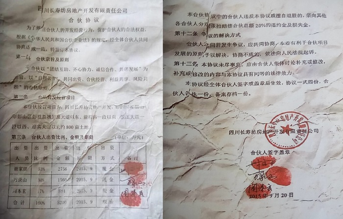 重庆开州区知名企业家疑遭套路骗,致公司破产 独立撰稿人 李海波 谢家田是重庆市开州区知名企业家,创办有重庆旭日建设工程( 集团) 有限公司、 重庆尊诚房地产开发公司、 重庆市开县创品小额贷款有限公司、 重庆尊诚能源投资(集团) 有限公司;是开县人大代表;曾先后获得了“首届开县民营企业家”、“企业文化先进个人”、“开县返乡 创业贡献奖”、“重庆优秀建筑企业经理”、“重庆市知名企业家” 称号。 近日谢家田向撰稿人讲述2015年受开州老乡的蒙骗收购四川长寿坊房产项目而陷入困境,公司破产了,自己也被列入失信人...... 高利贷者 入主四川长寿坊房产后拉谢入伙 2014年1月27日,四川飞洋置业有限公司,法人代表周先均,(以下简称飞洋公司)与四川省彭山县政府签订《华润万家彭山商业综合体及体育公园配套项目投资框架协议》,双方就该项目的位置、规模、土地达成框架协议。2014年8月20日,飞洋公司与重庆君宏信用担保有限公司达成《协议书》,由君宏公司出资3000万元收购彭山项目,2014年9月10日,飞洋公司与彭山县政府订立《中国长寿坊商旅综合开发项目投资协议书》,由飞洋公司出资在彭山县彭祖新城规划区内打造高档商住旅游特色街区。2014年11月27日,飞洋公司拍得PP2014-6号地块,面积107.65亩,土地出让金1.4555亿元,与彭山国土局签订《国有建设用地使用权出让合同》,飞洋公司交纳土地出让金及服务费2850万元。 1988年出生的开州人万永志是重庆君宏投资担保公司的法人,和铁桥镇国土所所长谭成毅从事高利贷业务2015年4月10日,他们和周本玄、周先均、罗仕川5人出资1080万在眉山市彭山区注册成立四川长寿坊房地产开发有限责任公司(以下简称长寿坊公司)法人代表万永志,父亲万录山(区畜牧局干部,长期吃空饷)担任董事长、总经理罗仕川,周本玄儿子周宇航担任出纳。而5人无开发房产经验,和谢家田熟悉的周本玄于2015年8月开始多次联系上开州区知名房产企业家谢家田,希望其合作开发该项目,他们负责筹钱,谢家田只负责开发。 周本玄等5人采取虚假宣传彭山区项目的规划,如容积率、周边配套如公益设施等,还私刻公章、伪造公文出示宣传。还向谢家田介绍宣传项目地块下面是砂石,价值2千多万元,可在挖建时利用产生巨大经济收益。 其实5人早在2015年5月6日将此收益以合同形式发包给四川瑞柯建筑有限公司,并向其支付15元/立方的土石方价款。不但无收益还反倒支付巨资,这真是说不通的做法。 5人将1080万元的长寿坊公司做账成5200万元,在4月10日注册时就已经形成,因为万永志购买项目时向周本玄借款1400万元无力偿便在当天以债转股形式给周本玄“到约定归还时间无钱,找周本玄协商,将其用于购买这款土地未溢价的5200万元按百分比计算转让股权作为支付下欠周本玄款项的抵债。当时周本玄考虑到有几百万元资金要及时归还给别人,就承担受让万永志21%的股权x5200万=1092万元的股本金,除去受让股权折股金后,还下欠308万元资金,由万永志向周本玄出具不等时间的借条。”而原会计杨兆沛移交的账册显示,4月10日后该项目产生的费用近2千万元。 2015年9月20日,周本玄、万录山、谢家田签订长寿坊公司合伙协议,显示长寿坊开发眉山市彭山区彭祖新城约800亩土地,约定谢家田投资2756万元占股53%,万录山投资2756万元占股30%,周本玄投资884万元占股17%,当日周宇航给其出具一张收据“今收到谢家田股本金2756万元”,该收据盖有公司公章和财务章。 2016年春节,万录山、周本玄又指示长寿坊原工作人员吴本高悄悄将公司虚假公文等重要资料取走。3个月后,吴本高又病逝。至今,这些重要资料下落不明。 签订的合伙协议,谢家田占53%股份在10月12日的公司章程中却只有33%股份 群狼齐上 写下多张借条后身不由己 谢家田加入长寿坊签订合伙协议后,一系列事情冒出来了,股权一下猛增为131%。先是四川飞洋公司周先均出面拿出协议,说长寿坊欠他3千万元和占有10%股份和公司10%利润。奇怪的是,长寿坊公司花费了这么多钱,但主要的土地出让金却没有缴纳,万永志仅支付了飞洋公司300万元保证金。 于是在2016年1月15日,飞洋公司与长寿坊公司谢家田订立《协议书》,由长寿坊公司支付飞洋公司3000万元,谢家田支付周先均10%干股,长寿坊公司10%利润为周先均顾问费。 频繁的股权变更 而后谭成毅也说有720万元占股13%,但原始账册显示其只有597.6万元,其提供给法院的银行流水多少转给周本玄,属于二人之间的经济往来。 之后长寿坊会计杨兆沛也出面说占公司股份1%,各原股东认可后谢家田又向杨兆沛出具52万元的借条。 10月12日,长寿坊公司章程修正案,将第8条股东名称等修改为:谢家田出资356.4万元占股33%,万永志出资324万元占股30%,周本玄出资183.6万元占股17%,周先均出资108万元占股10%,罗仕川出资108万元张10%。出资时间为2014年12月23日。 2015年11月10日,长寿坊章程修正案,显示周本玄将持有17%股份转让给谢家田,此股权1092万元谢家田履行完毕。据此谢家田占股50%,万永志占股30%,周先均占股10%,罗仕川占股10%。出资时间为2014年12月23日。 2016年1月13日,谢家田给廖代华出具220万元的借条,显示是万录山股权转让款中减除。 2016年1月15日,长寿坊章程修正案,显示周先均将持有10%股份转让给谢家田。据此谢家田占股60%,万永志占股30%,罗仕川占股10%。出资时间为2024