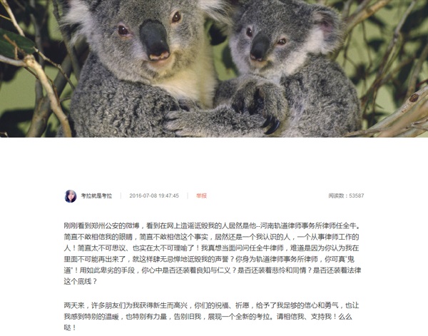 中国警察网讯 7月8日郑州市公安局官方微博@平安郑州通报,河南轨道律师事务所律师任全牛编造并在互联网上散布当事人人身受辱的虚假信息,给当事人赵威名誉造成严重损害,涉嫌犯罪,被郑州公安机关依法刑事拘留。当晚19时47分,赵威在其微博@考拉就是考拉上表达了对河南轨道律师事务所律师任全牛在网上对其造谣诋毁的事实表示震惊和愤怒,她在微博中质问:简直太不可思议、也实在太不可理喻了!我真想当面问问任全牛律师,难道是因为你认为我在里面不可能再出来了,就这样肆无忌惮地诋毁我的声誉?你身为轨道律师事务所律师,你可真“鬼道”!用如此卑劣的手段,你心中是否还装着良知与仁义?是否还装着悲怜和同情?是否还装着法律这个底线?