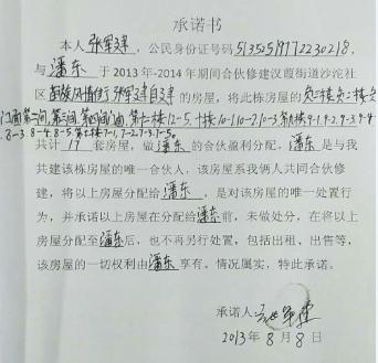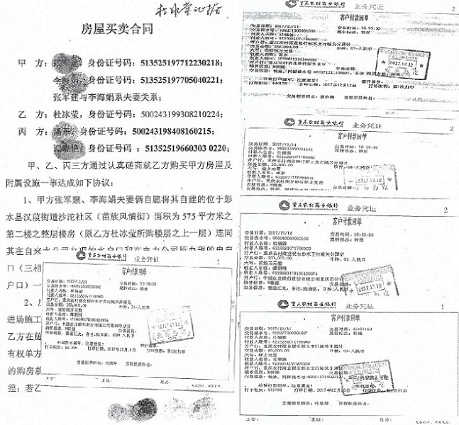 潘双明作为彭水县地税局稽查局副局长,和潘东一道长期发放高利贷,在职期间借款 80万元给张军建,月息高达4分的,每月都会收到3.2万元的汇款,总计近42.4万元。《彭水苗族土家族自治县规划局关于居民拟自建住房选址批复文号(2013)005号》这个房子自始至终都是张军建一个人所有,没有其他共建人。在南岸区铜元局派出所几位民警的见证下,张军建亲笔手写了一份情况说明,张军建明确说明房屋由张军建一人所建,并无共建人。而潘东等人实际是彭水法院项目合伙人。张军建还在执行局执行笔录、公安机关等笔录中,也明确没有共建人,但潘东却拿着威逼张军建签的共建协议和承诺书,将大量房产低价出售他人,导致现在执行难。