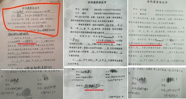 2017年下半年,张军建被潘东、秦建波等人关在水天阁精品酒店,以要杀他老婆孩子的威胁逼迫下写下承诺书和共建协议,将位于彭水县汉葭街道沙坨社区苗族风情街张军建整栋自建房写成张军建和潘东共建,秦建波在共建协议见证人上签字,而这个共建协议书、承诺书是潘东早就准备好拿来的,时间故意提前写到了2013年8月8日,张军建只是在上面签了一个名字并盖了个手印,连原件他本人都没有一份。同时共建协议书就有几种版本、几个人。 协议中潘双明的合作建房80万元是借给张军建是月息4分的高利贷;潘东的760万元其实就是和秦建波投资的3百万元与张军建承建的法院项目,亏损后就利滚利算成760万元找张军建要钱。潘东等人就用这个伪造的承诺书蒙骗那些买房人,低价将房子出售给了别人。 潘东等人为了获取非法利益,通过采取恶意串通,捏造事实、伪造变造证据、虚构法律关系等方式提起民间借贷民事诉讼,意图使人民法院作出错误裁判对抗已经生效并开始执行的判决。 2019年3月10日潘东向重庆市第四中级人民法院提起撤销之诉,其出具的证据《合伙建房协议书》,在庭审中,丁正谊承认该协议是虚假的,是刻意将时间提前的,并且根本没有合伙建房,而是其他的借款债权,有庭审过程的录音录像为证。潘东等人敢如此藐视法庭纪律,公然制造虚假的证据,合谋串通对抗已经生效的判决,侵犯第三人合法权益,与其强大的社会背景及关系网有关,给其代理的法律工作者郑重,号称在彭水、黔江两地没有打不赢得官司,因为其哥哥以前是法院执行局局长,现在已离职开律师事务所了。