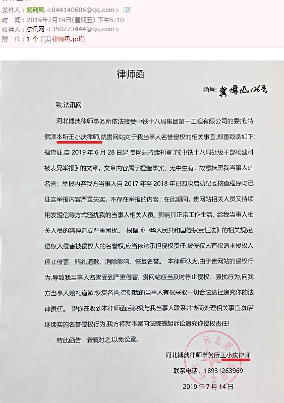 中铁十八局项目经理杨建科涉嫌多起违法火爆网络,百余领导无动于衷 独立撰稿人 李海波  6月28日,法讯网发布了《中铁十八局一公司项目经理杨建科被亲表兄举报》,搜狐、一点资讯、凤凰网等近百家网站予以转发,引起广大网友强烈反响。 7月11日,法讯君按照胡祥付提供的百余位中铁领导陆续发了短信,请求领导予以了解回复。之后胡祥付也给领导们发了短信。 这位中铁领导很不耐烦,不知道是什么职位 这位部长态度,我们只能呵呵 中铁需要这种领导多一点 7月14日的这律师函值得推敲,一是没有说文章链接,谁知道是哪个网页?二是说是诽谤,你倒说下哪里诽谤了?胡祥付举报事实清楚,图文并茂,你得具体阐述一下啊!三是这律师是中铁十八局一公司职员,怎么一转眼是律师了?四是7月14日的律师函,直到7月19日下午5:10才发出。个中原因只有当事人清楚,法讯君不便猜测。  鉴于此,法讯网没有理会该函件。 中铁十八局一公司给这位假记者(胡祥付向民主与法制社投诉其收了五万元的事情,社里答复没这人,但表示介绍信是真的)的回复也说明杨建科存在一些问题,但就是没有书面答复给胡祥付。 至此,曝光已经过去二个多月了,但中铁方面没有丝毫动静。 杨建科居然是文明家庭标兵。 杨建科只有唯一一家全家福,果真是因为忙吗?看看下面的这小老婆和儿子图片,也没有杨建科本人呢! 杨建科情人王诺(杨建科叫蛋妈)和儿子留影 他包养小老婆所生儿子都6岁了,项目部的人都清楚!将杨建科上报为文明家庭标兵,中铁十八局的职工们是否都是以他为标准而生活和工作的?! 胡祥付表示还将爆出更多中铁十八局第一公司的更多问题,并对真实性负一切法律责任。