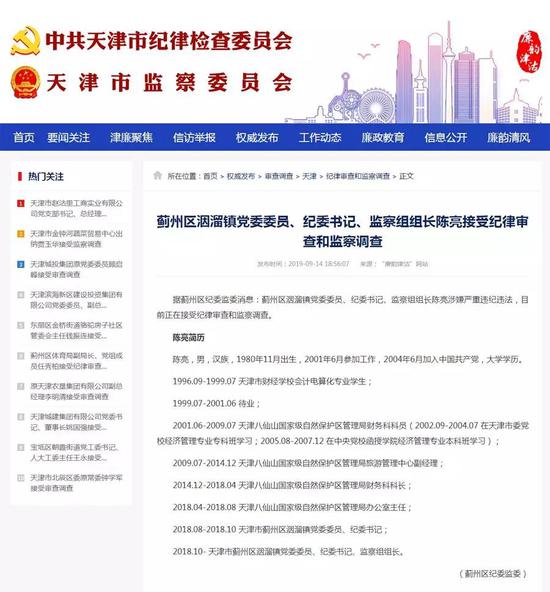 据蓟州区纪委监委消息:蓟州区洇溜镇党委委员、纪委书记、监察组组长陈亮涉嫌严重违纪违法,目前正在接受纪律审查和监察调查。 ![]() 廉韵津沽网站截图 陈亮简历 陈亮,男,汉族,1980年11月出生,2001年6月参加工作,2004年6月加入中国共产党,大学学历。 1996.09-1999.07 天津市财经学校会计电算化专业学生; 1999.07-2001.06 待业; 2001.06-2009.07 天津八仙山国家级自然保护区管理局财务科科员(2002.09-2004.07 在天津市委党校经济管理专业专科班学习; 2005.08-2007.12 在中央党校函授学院经济管理专业本科班学习); 2009.07-2014.12 天津八仙山国家级自然保护区管理局旅游管理中心副经理; 2014.12-2018.04 天津八仙山国家级自然保护区管理局财务科科长; 2018.04-2018.08 天津八仙山国家级自然保护区管理局办公室主任; 2018.08-2018.10 天津市蓟州区洇溜镇党委委员、纪委书记; 2018.10- 天津市蓟州区洇溜镇党委委员、纪委书记、监察组组长。 据蓟州区纪委监委消息:蓟州区体育局副局长(正处级)、党组成员任秀柏涉嫌严重违纪违法,目前正在接受纪律审查和监察调查。 ![]() 廉韵津沽网站截图 任秀柏简历 任秀柏,男,汉族,1968年5月出生,1990年8月参加工作,1995年4月加入中国共产党,大学学历。 1986.09-1990.07 天津农学院园艺系果树专业学生; 1990.07-1990.08 毕业待分配; 1990.08-1997.12 天津市蓟县林业局科技站技术员(1992.03-1993.05 挂任天津市蓟县白涧乡科技副乡长); 1997.12-1999.03 天津市蓟县林业局林业站副站长; 1999.03-2000.07 天津市蓟县林业局林业产业开发中心副主任(1993.05-2000.07 挂任天津市蓟县邦均镇科技副镇长); 2000.07-2007.05 天津八仙山国家级自然保护区管理局副局长、党组成员; 2007.05-2012.06 天津八仙山国家级自然保护区管理局局长、党组书记; 2012.06-2015.12 天津市蓟县林业局党委书记、副局长; 2015.12-2017.01 天津市蓟县林业局党委书记; 2017.01-2017.03 天津市蓟州区林业局党委书记; 2017.03-2019.09 天津市蓟州区委党校常务副校长、党总支部书记; 2019.09- 天津市蓟州区体育局副局长(正处级)、党组成员。 据南开区纪委监委消息:天津市园林海河游览管理中心党总支书记、主任陈周羡涉嫌严重违纪违法,目前正在接受纪律审查和监察调查。 ![]() 廉韵津沽网站截图 来源:廉韵津沽 |
