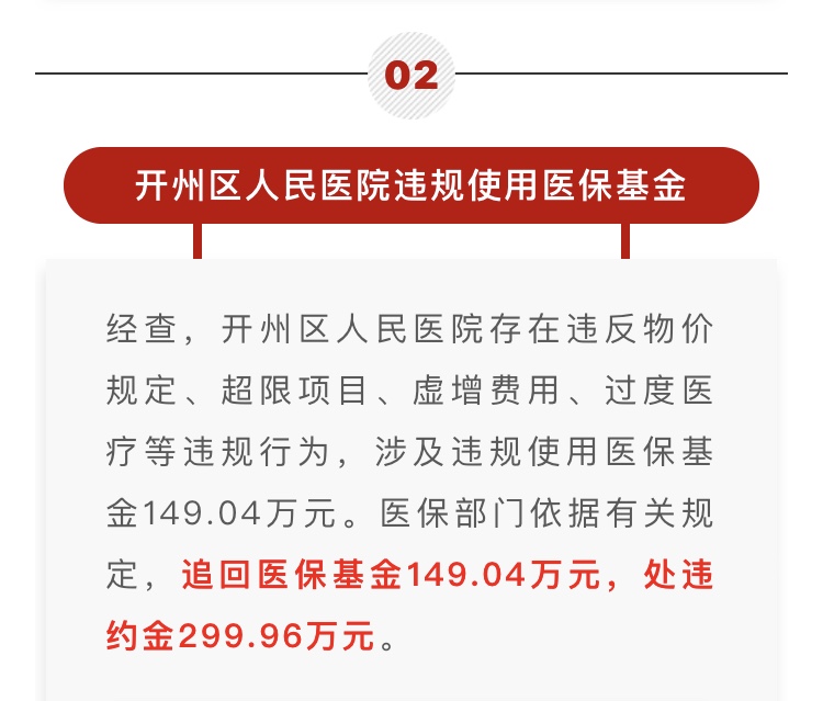 经查,开州区人民医院存在违反物价规定、超限项目、虚增费用、过度医疗等违规行为,涉及违规使用医保基金149.04万元。医保部门依据有关规定,追回医保基金149.04万元,处违约金299.96万元。