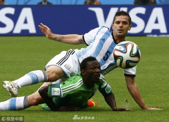 2014年6月25日,巴西贝拉里奥球场,2014巴西世界杯小组赛F组,尼日利亚Vs阿根廷。 加戈与祖万在拼抢后双双倒地