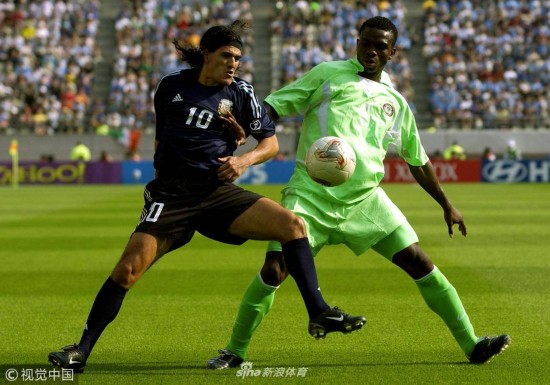 2002年6月2日,韩国釜山,2002韩日世界杯小组赛,阿根廷Vs尼日利亚。 上半时尼日利亚球员阿德波尤的一脚倒钩。
