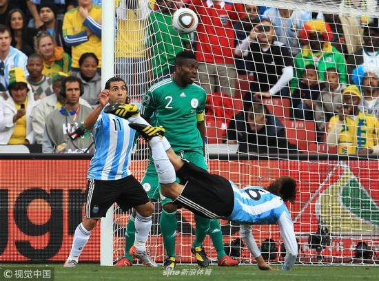 2010年6月12日,南非约翰内斯堡,2010世界杯B组小组赛,阿根廷Vs尼日利亚。海因策头球攻门。