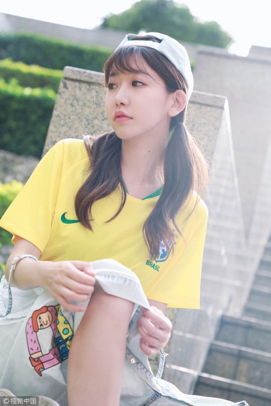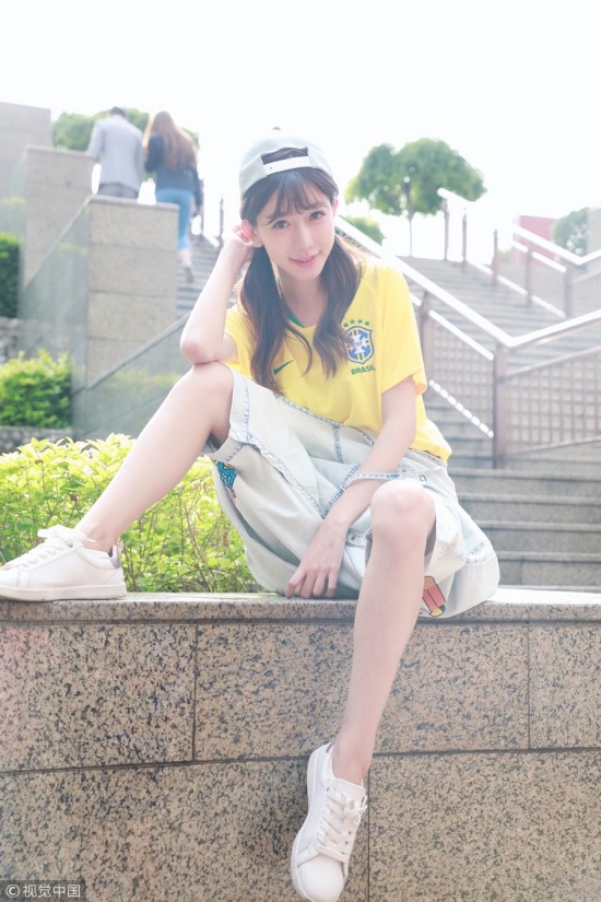 2018年6月25日,北京,“小林志玲”陈潇化身黄衫军团清纯亮相,皮肤白皙美腿修长,助威巴西队获胜。