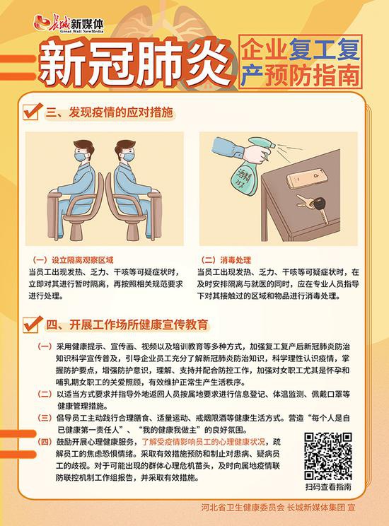 | 在河北省卫生健康委员会的指导下,长城新媒体集团倾力打造《权威科普》栏目,以融媒产品形式,生动、及时、准确地发布权威防疫知识,指导公众科学防疫,战胜疫情。第八期新冠肺炎企业复工复产预防指南,请接收。 一、随着疫情逐渐稳定,各地的企业逐步开始了复工复产。为了减少疫情风险,企业在复工复产前需要提前做好预防措施。 (1)员工返岗前要掌握其流动情况,提前排查可能存在的感染风险。发现异常要及时报告并釆取防控措施。 (2)对员工个人和家属要实施健康监测,发现异常要及时采取措施。 ![]() 做好疫情防控知识宣传教育。 (3)提高员工的自我防护意识和能力,做好新冠肺炎防控知识培训和宣传教育。 (4)减少不必要的人员进出企业,对来访人员要加强体温检测和登记,佩戴口罩才可进入。 (5)防疫物资要准备充足,发挥好企业医务室的作用。 二、在生产过程中,人员接触增多,做好预防很重要。 (1)加强通风换气,保持室内空气流通。如果使用空调,要保证空调系统供风安全畅通,不使用空调时应当关闭回风通道。 ![]() 七步洗手法。 (2)员工在工作场所要勤洗手,确保洗手、喷淋等设施运行正常。 (3)做好工作场所物体表面以及工作服、座椅套等纺织物的清洁消毒工作,加强职工宿舍、食堂以及卫生间的清洁与通风。 (4)减少开会次数,推荐开视频会议,推荐错峰就餐,减少员工聚集和集体活动。 (5)加强垃圾分类管理,及时收集并清运,加强对垃圾盛装容器的清洁和消毒。 ![]() 当员工出现可疑症状时,要马上做好三件事。 三、当员工出现发热、乏力、干咳等可疑症状时,要马上做好三件事。 (1)立即对其进行暂时隔离处置。 (2)及时安排就医。 (3)在专业人员指导下对其接触过的区域和物品进行消毒处理。 (资料来源:国家卫生健康委员会) ![]() 新冠肺炎企业复工复产预防指南1。 ![]() 新冠肺炎企业复工复产预防指南2。 ![]() 新冠肺炎企业复工复产预防指南3。 |