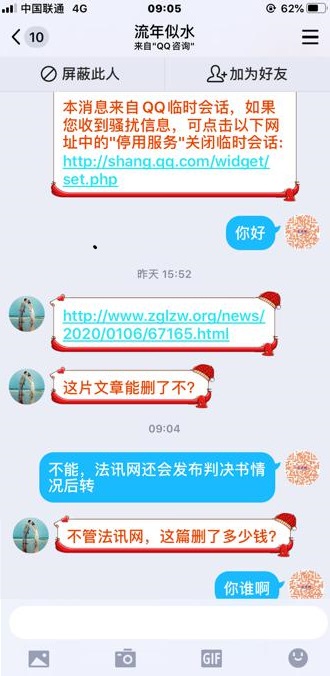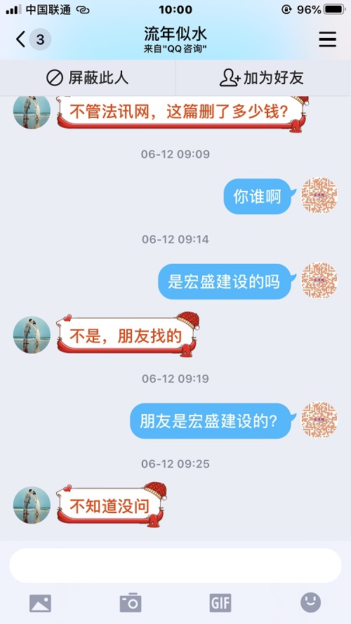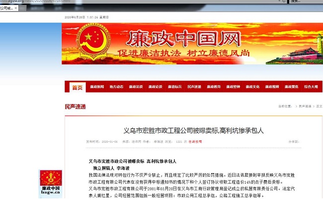![]() 6月12日,一陌生QQ通过临时对话联系廉政中国网,发来一链接http://www.zglzw.org/news/2020/0106/67165.html请求删除文章,打开链接是《义乌市宏胜市政建设公司被曝卖标,高利坑惨承包人》,便告之不能删除,并表示法讯网还会发布后转,对方答复:不管法讯网,这篇删了多少钱? ![]() 该文章反映的是义乌市宏胜市政工程有限公司(现宏胜建设有限公司)代表在没有获得中标通知书的情况下和个人签订协议收取工程造价14%的点子费后卖标:2014年5月,多次合作的朋友邱敬元(重庆某公司董事长)给曾胜电话说有个优质工程中标了可以给他做。22日,宏胜市政代表人邱敬元和曾胜签订付款协议。约定将中标价为2214.3599万元的“渝北双汇桥片区汇流积水整治工程”承包给曾胜,曾胜为此花了400多万元获得这个造价2千多万元的工程,约定的买标按14个点子算,也就是276万多元。 这是谁?管理人员问其没有答复,便有了如下对话: ![]() 之后管理人员没有再答复。想要花钱删帖?宏胜建设有限公司,你要干嘛?!不知道非法删帖违法么?你们多次围标后卖标,本就违法,还要再次违法呀?! ![]() 经查询,联系QQ是这个。 相关文章:www.cqfzb.com/show.asp?id=6929">重庆渝北区建委:宏胜公司卖标过了追溯期 |