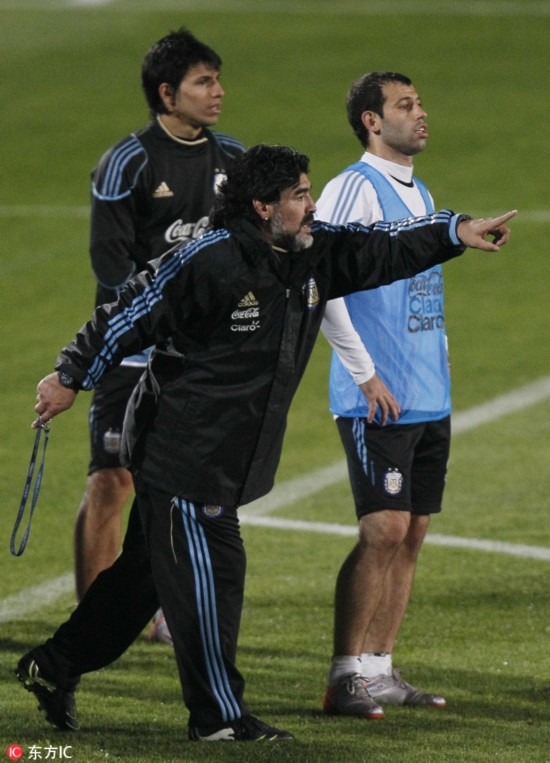 当地时间2018年6月30日,俄罗斯喀山,2018世界杯1/8决赛,法国4-3阿根廷。赛后,阿根廷球员马斯切拉诺宣布退出国家队。2006-2018,马斯切拉诺4次参加世界杯,出战20场;国家队层面,更是创纪录的为国征战147场。“是时候说再见了。从现在起,我是一名阿根廷球迷了。”,愿未来的日子,小马哥一切都好。图为马拉多纳挂帅,阿根廷训练备战。