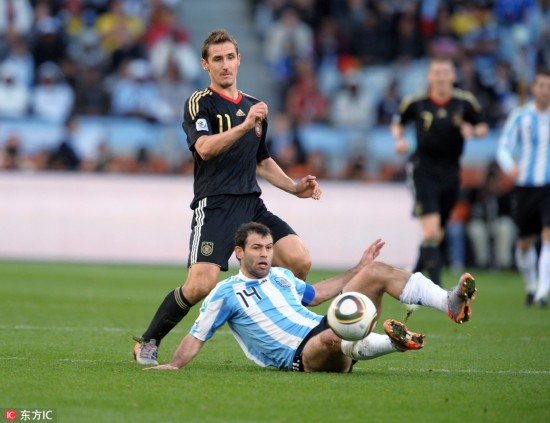 当地时间2018年6月30日,俄罗斯喀山,2018世界杯1/8决赛,法国4-3阿根廷。赛后,阿根廷球员马斯切拉诺宣布退出国家队。2006-2018,马斯切拉诺4次参加世界杯,出战20场;国家队层面,更是创纪录的为国征战147场。“是时候说再见了。从现在起,我是一名阿根廷球迷了。”,愿未来的日子,小马哥一切都好。图为2010年南非世界杯1/4决赛,德国4-0阿根廷。马斯切拉诺防守克洛泽