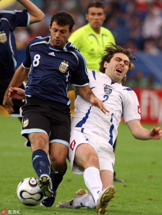 当地时间2018年6月30日,俄罗斯喀山,2018世界杯1/8决赛,法国4-3阿根廷。赛后,阿根廷球员马斯切拉诺宣布退出国家队。2006-2018,马斯切拉诺4次参加世界杯,出战20场;国家队层面,更是创纪录的为国征战147场。“是时候说再见了。从现在起,我是一名阿根廷球迷了。”,愿未来的日子,小马哥一切都好。图为当地时间2006年6月16日,德国盖尔森基兴,2006年德国世界杯小组赛,阿根廷6-0塞黑。
