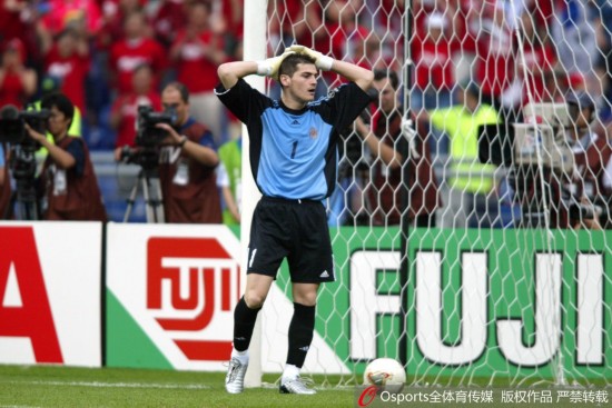 2002年韩日世界杯1/4决赛:韩国队5:3点球淘汰西班牙 西班牙队守门员卡西利亚斯失利后很懊恼。 |
