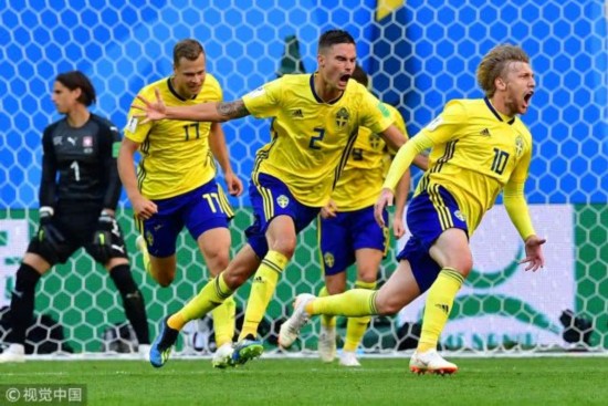 腾讯体育7月3日讯 凭借不懈的努力和运气的帮助,瑞典在八分之一决赛战胜瑞士之后晋级俄罗斯世界杯八强。在历史性的第50场世界杯比赛里,这支平民化的瑞典实现了真正的突破,不仅24年来首次在淘汰赛取胜,而且自本土世界杯以来首次取得连胜,也得以24年来首次晋级世界杯八强。